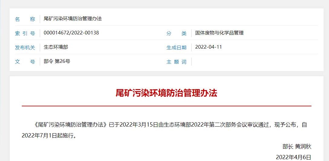 《尾矿污染环境防治管理办法》将于今年7月1日生效,其中明确要求尾矿库运营、管理单位建立健全尾矿库污染隐患排查治理制度。《指南》发布,将指导生态环境部门组织开展尾矿库污染隐患排查治理和监督管理,以及指导尾矿库运营、管理单位自行开展尾矿库污染隐患排查治理。
